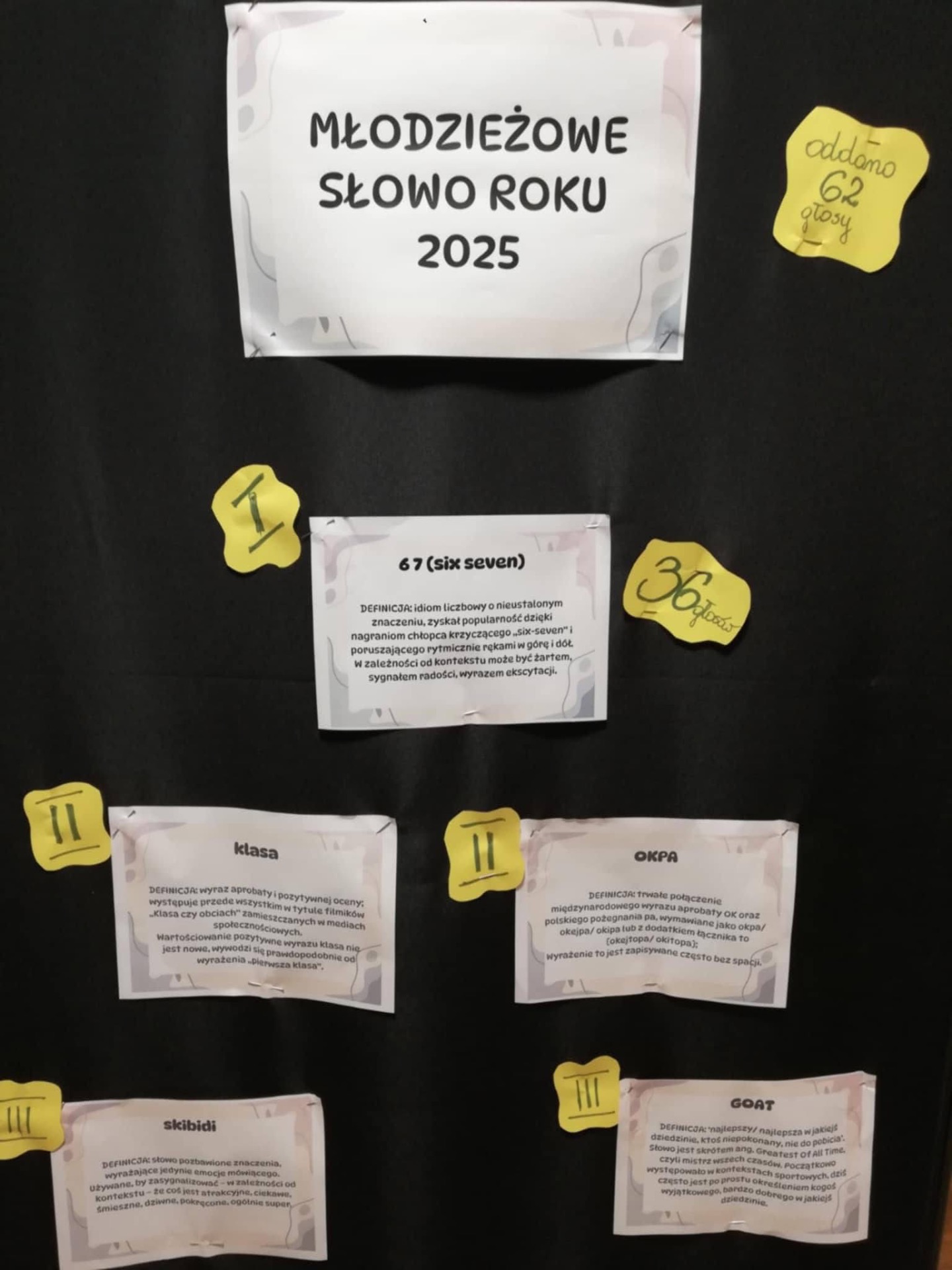 👉 Już tradycyjnie włączyliśmy się w ogólnopolskie wybory Młodzieżowego Słowa Roku 2025. Od kilku lat taki plebiscyt organizuje Polskie Wydawnictwo Naukowe PWN. Nasi uczniowie głosowali na jedno ze słów, które znalazły się w finale. Oto wyniki: