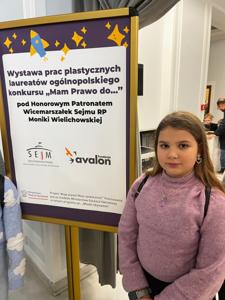 Gratululejmy jeszcze raz Blance zdobycia tytułu laureata w ogólnopolskim konkursie plastycznym "Mam prawo do...". Cieszymy się , że praca naszej uczennicy jest wystawiona w Sejmie RP w Warszawie , gdzie można ją oglądać przez kilka następnych dni.