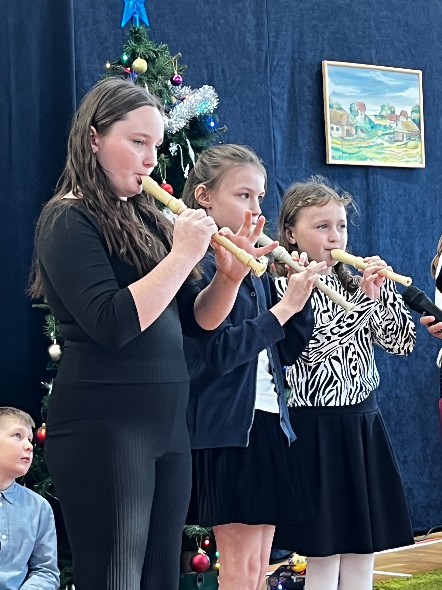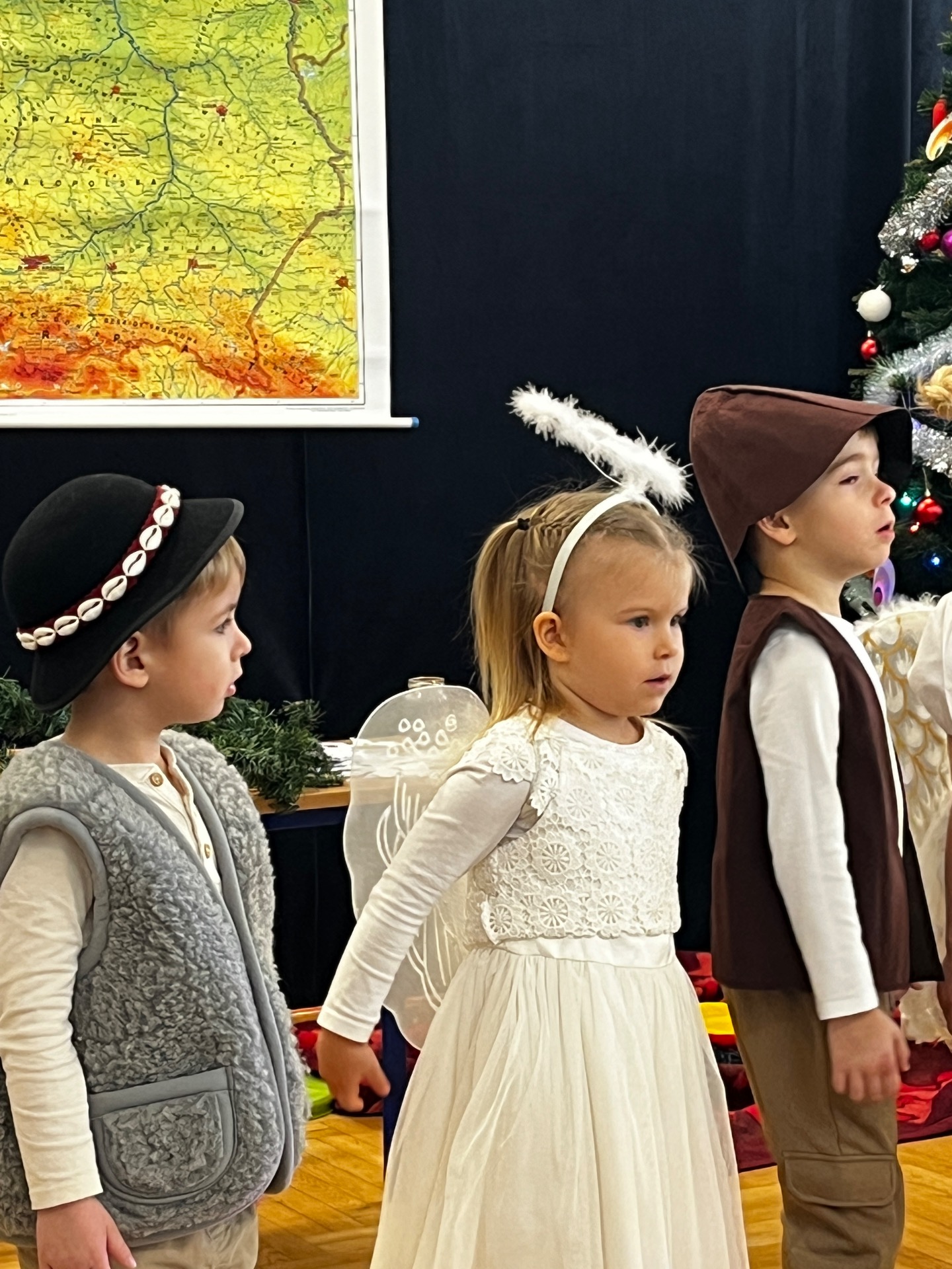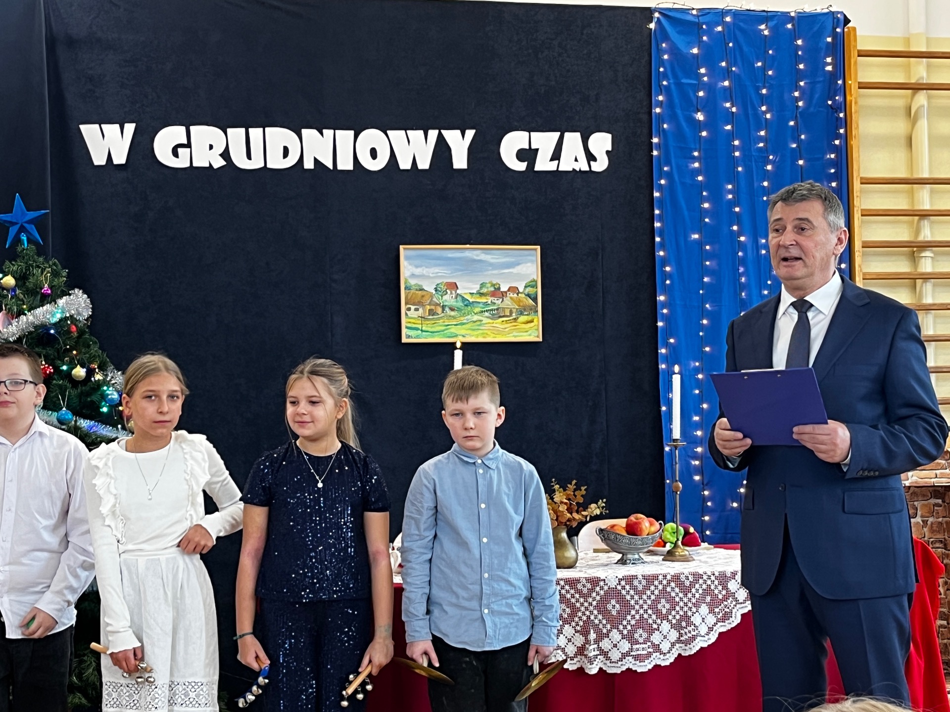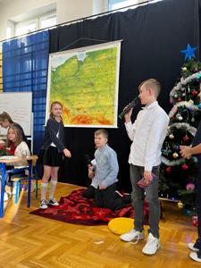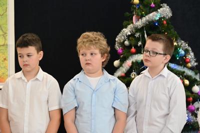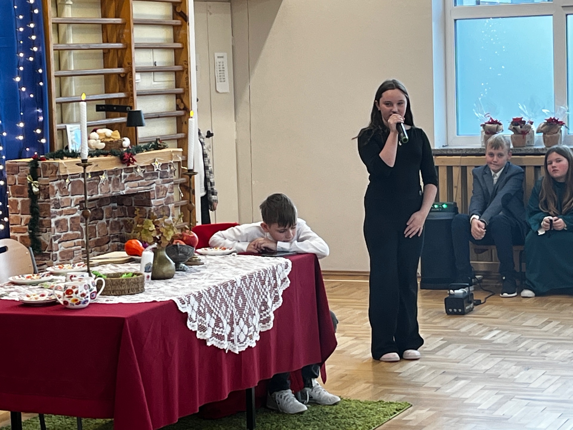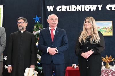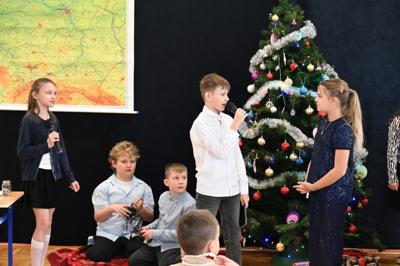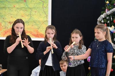 🌲Potem przyszedł czas na starszych uczniów, którzy zagrali na instrumentach utwór "Walc zimowy". Zamiast tradycyjnych jasełek zebrani zobaczyli współczesną opowieść o Kubie, chłopcu, który zapomniał, co powinno być najważniejsze w życiu. Mądrym treściom towarzyszyła muzyka na żywo: gra na flecie i pianinie. Wystąpili uczniowie klasy 3 i 4, a na pianinie przygrywała Hania Leśniak z klasy VI. Historia nawiązywała do "Opowieści wigilijnej" Dickensa, a za scenariusz i reżyserię odpowiadały nauczycielki: Maria Brzoza i Olga Zawodnik-Purtak.