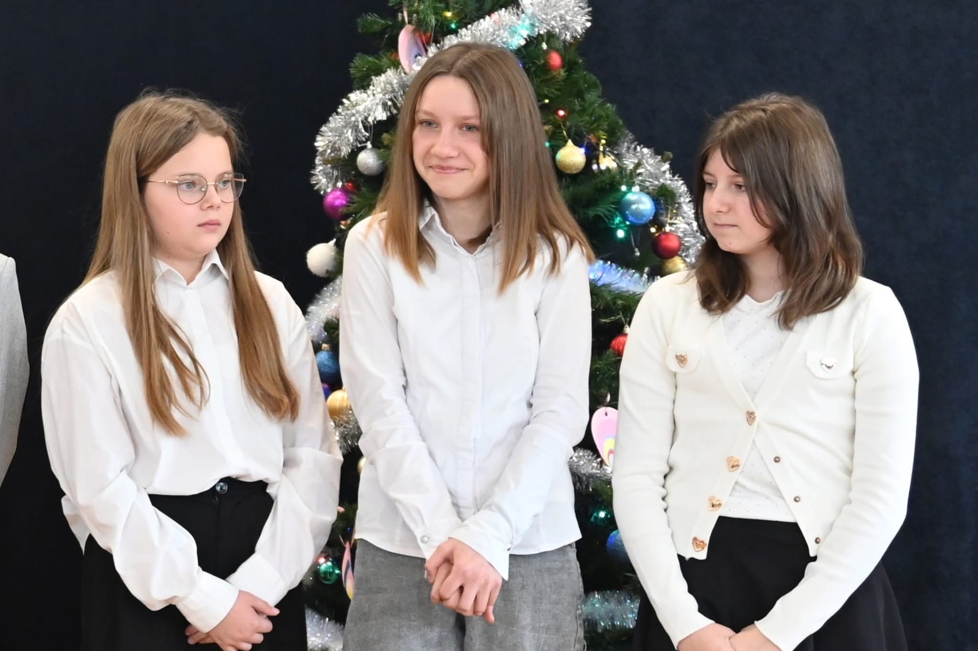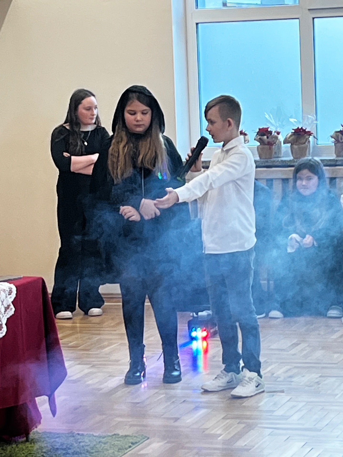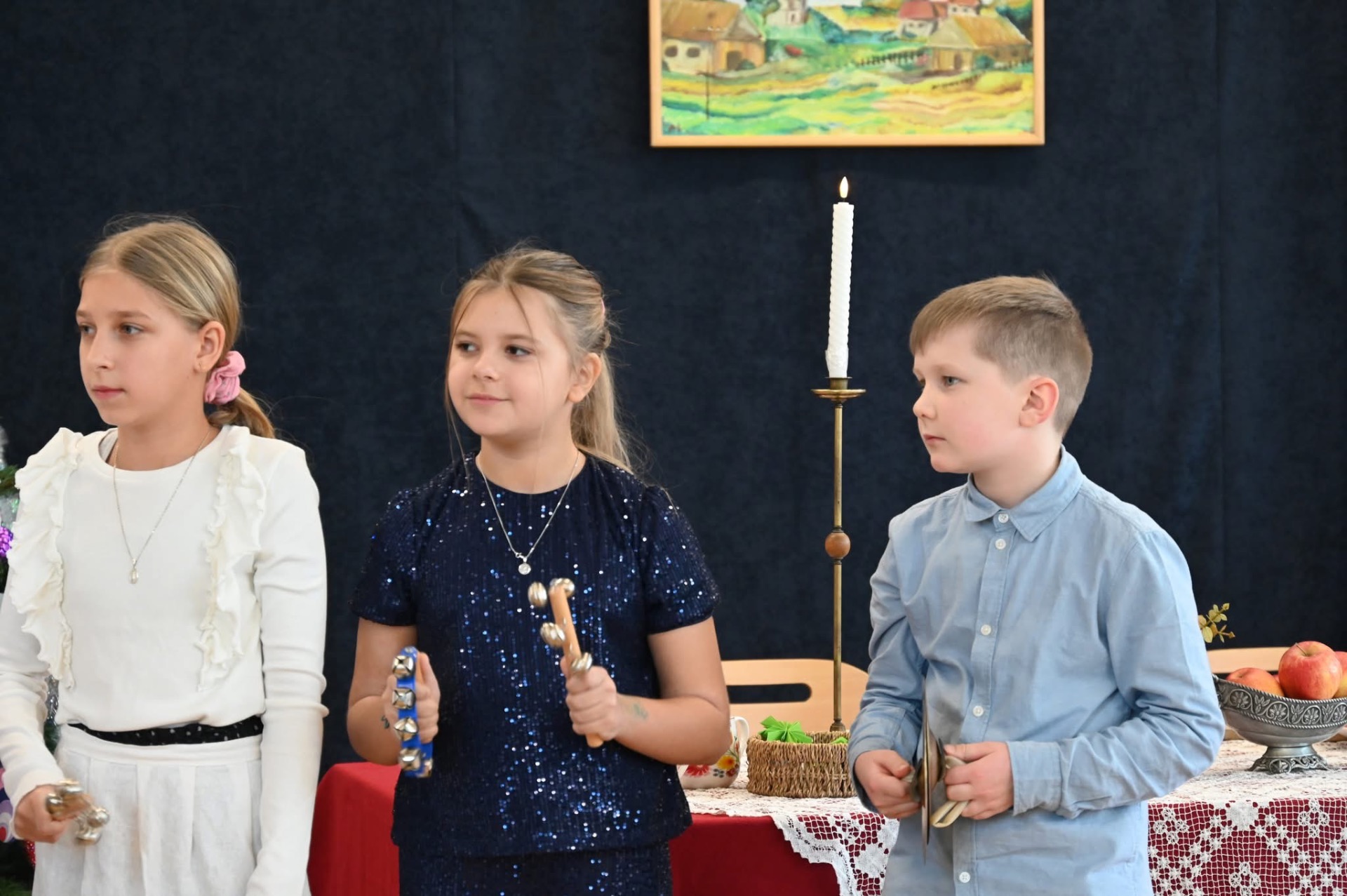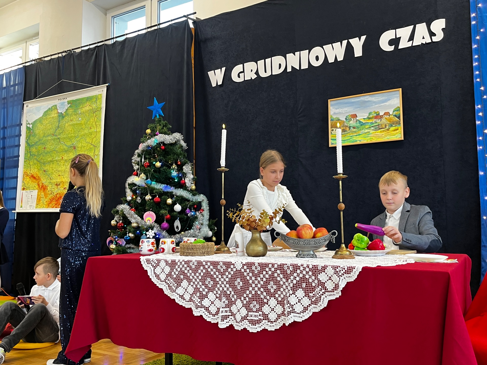 🌲Potem przyszedł czas na starszych uczniów, którzy zagrali na instrumentach utwór "Walc zimowy". Zamiast tradycyjnych jasełek zebrani zobaczyli współczesną opowieść o Kubie, chłopcu, który zapomniał, co powinno być najważniejsze w życiu. Mądrym treściom towarzyszyła muzyka na żywo: gra na flecie i pianinie. Wystąpili uczniowie klasy 3 i 4, a na pianinie przygrywała Hania Leśniak z klasy VI. Historia nawiązywała do "Opowieści wigilijnej" Dickensa, a za scenariusz i reżyserię odpowiadały nauczycielki: Maria Brzoza i Olga Zawodnik-Purtak.