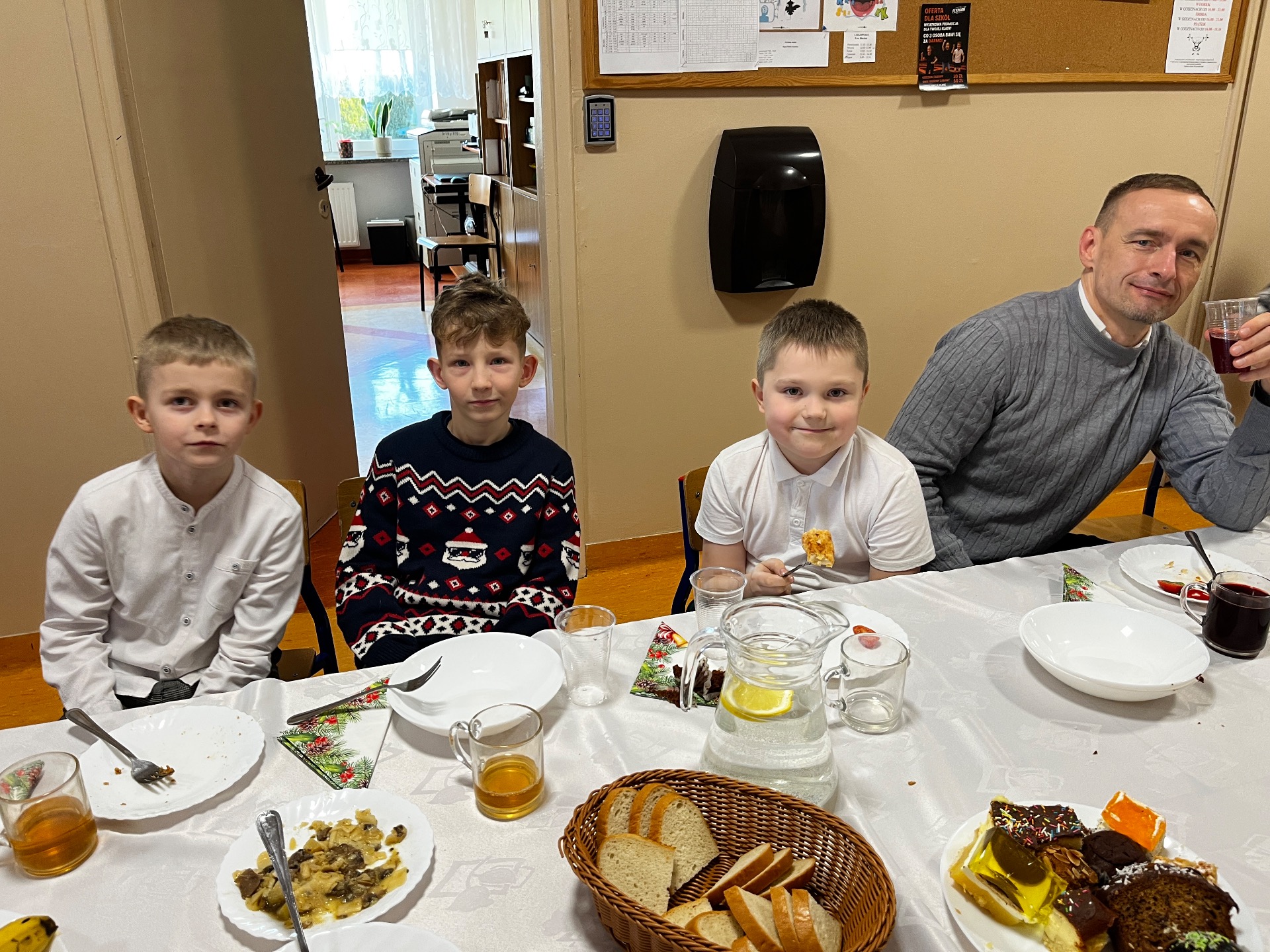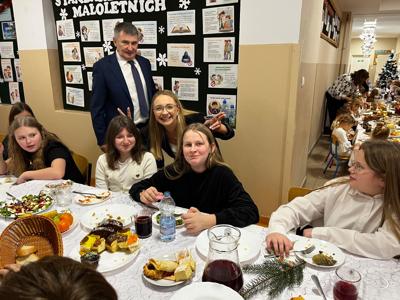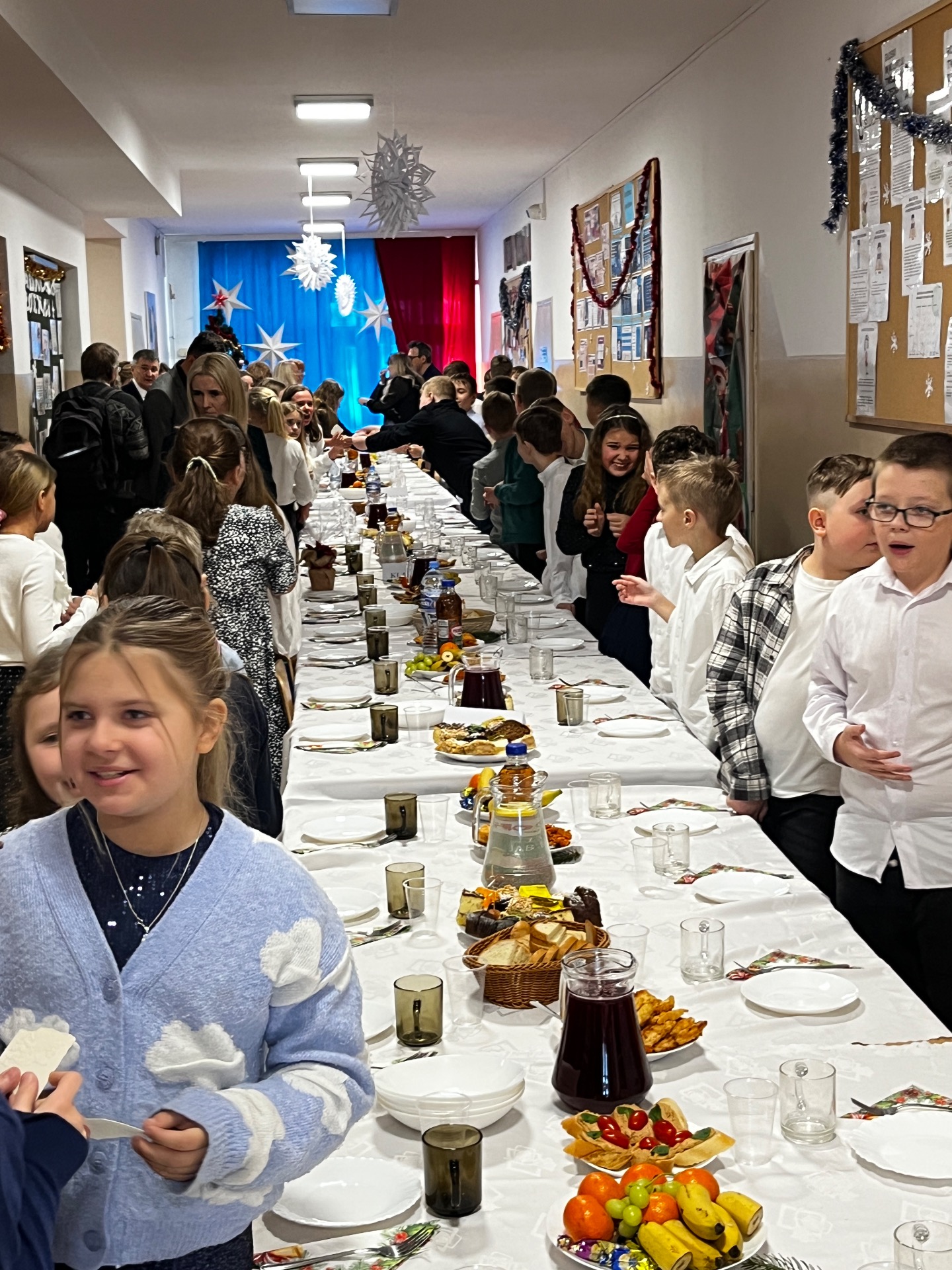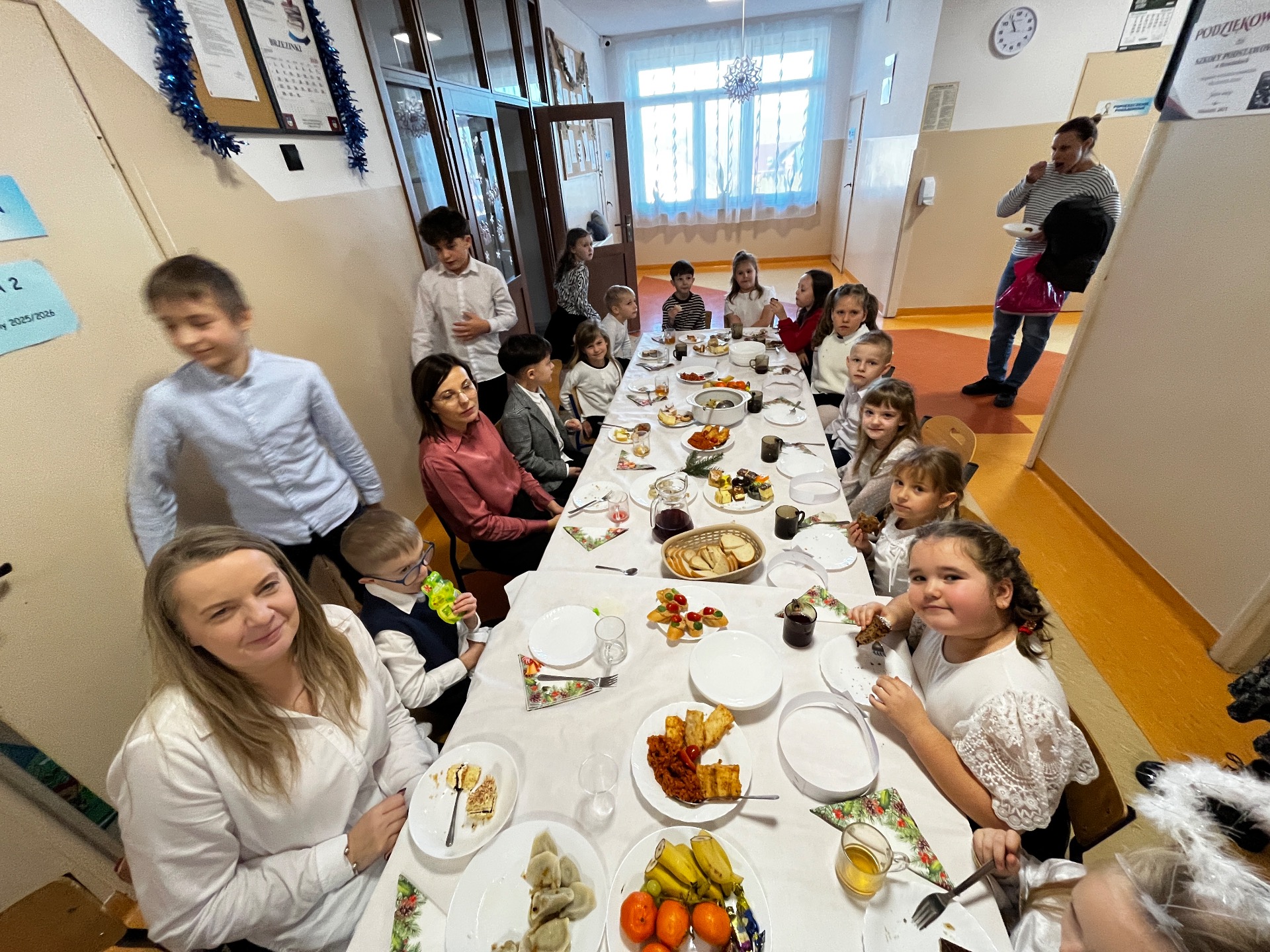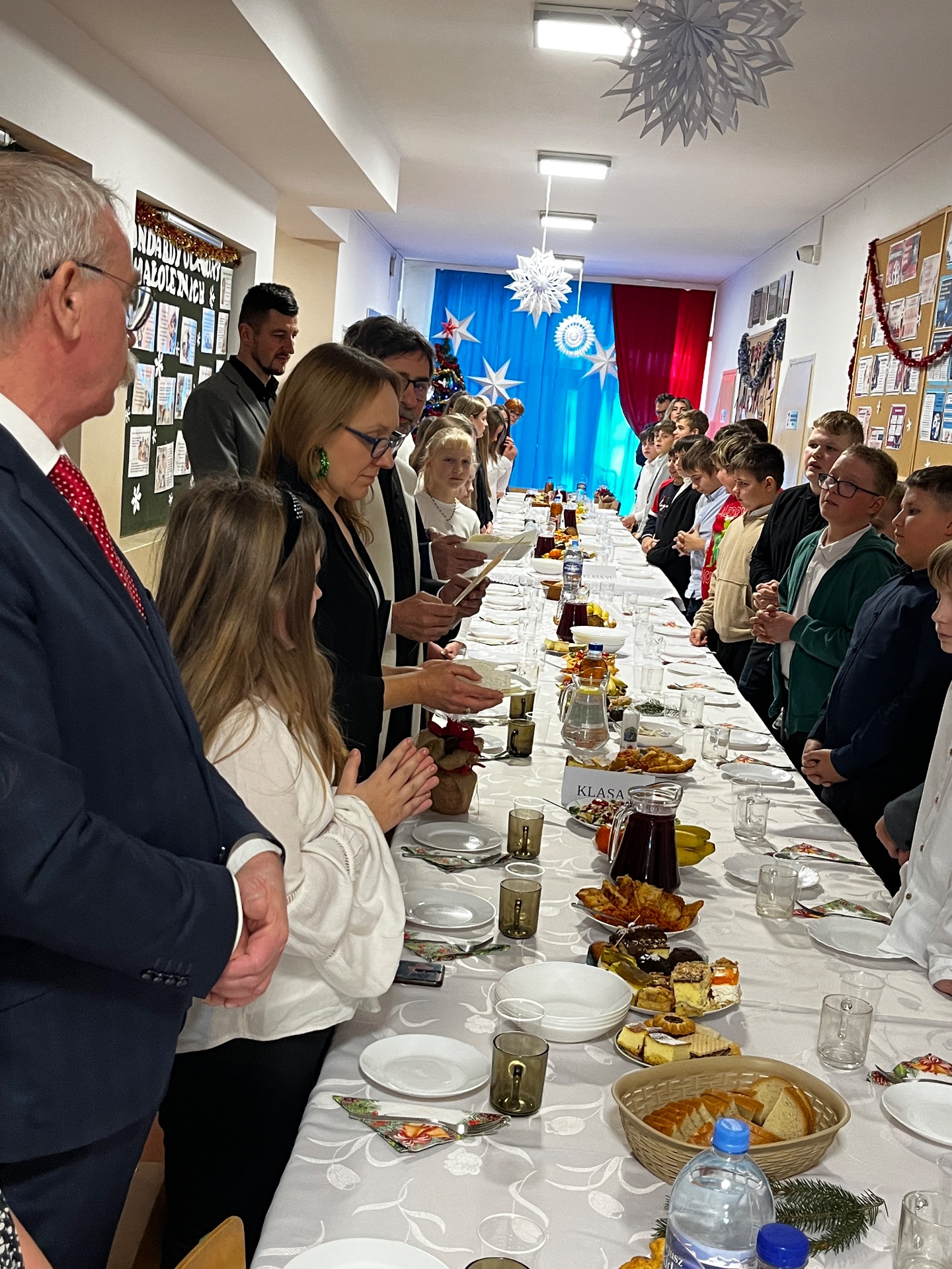 🧁Po części artystycznej przyszła kolej na spotkanie wigilijne. Już od kilku lat naszą tradycją jest wspólny stół wigilijny na szkolnym korytarzu. Po poświęceniu opłatków przez ks. Zbigniewa Kądzielę i życzeniach złożonych przez wójta Tomasza Lato, wszyscy zasiedli do stołu. Ależ było dużo pyszności!