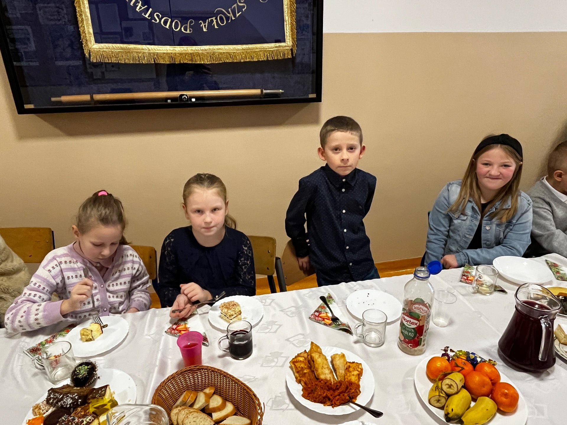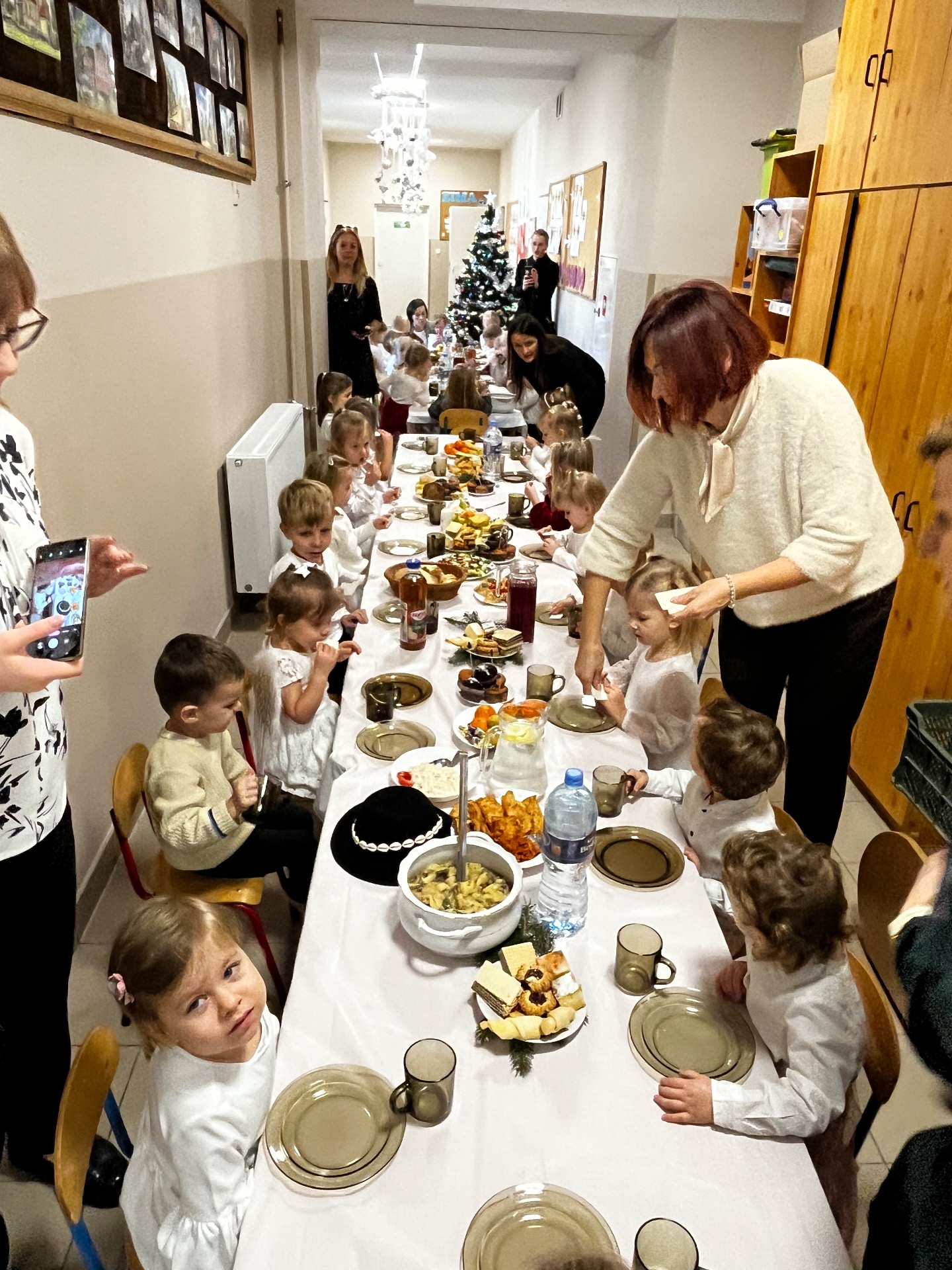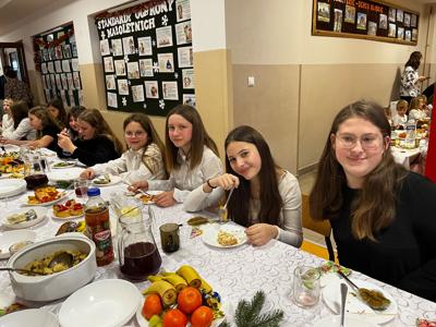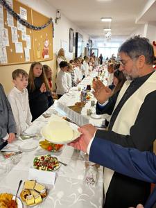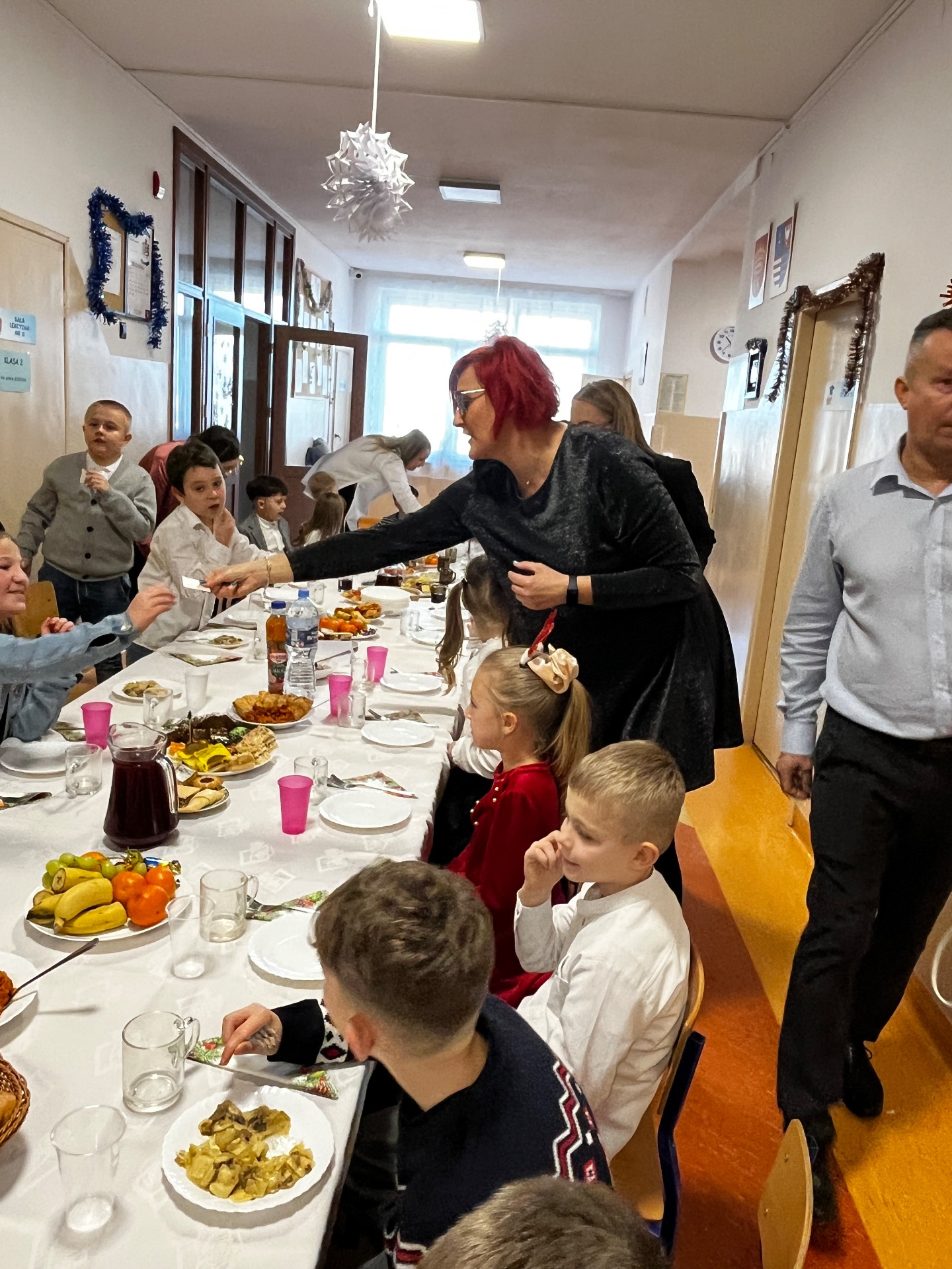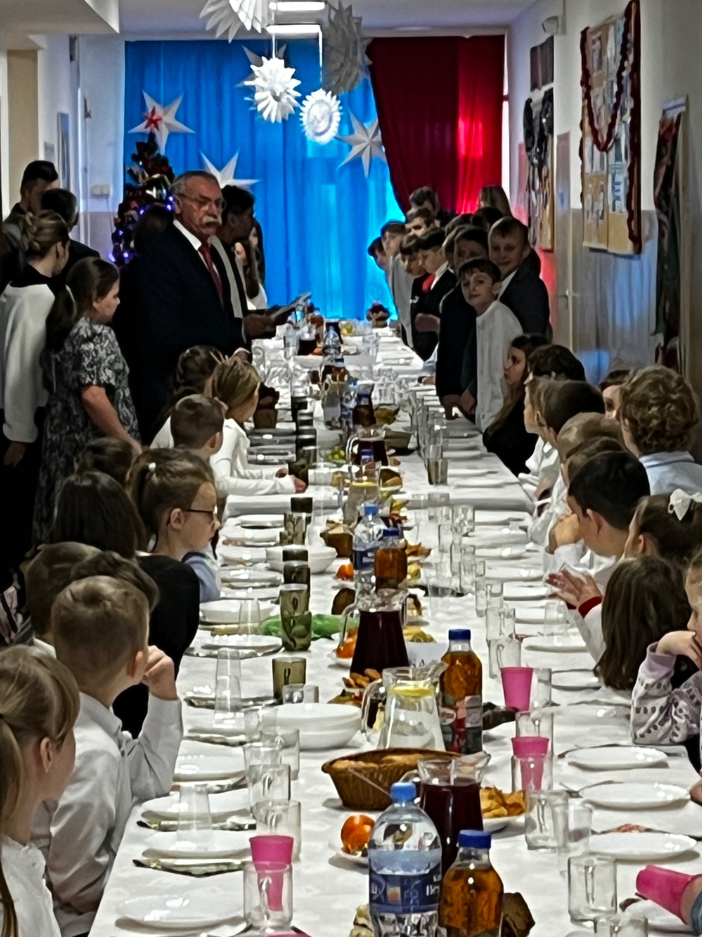🧁Po części artystycznej przyszła kolej na spotkanie wigilijne. Już od kilku lat naszą tradycją jest wspólny stół wigilijny na szkolnym korytarzu. Po poświęceniu opłatków przez ks. Zbigniewa Kądzielę i życzeniach złożonych przez wójta Tomasza Lato, wszyscy zasiedli do stołu. Ależ było dużo pyszności!