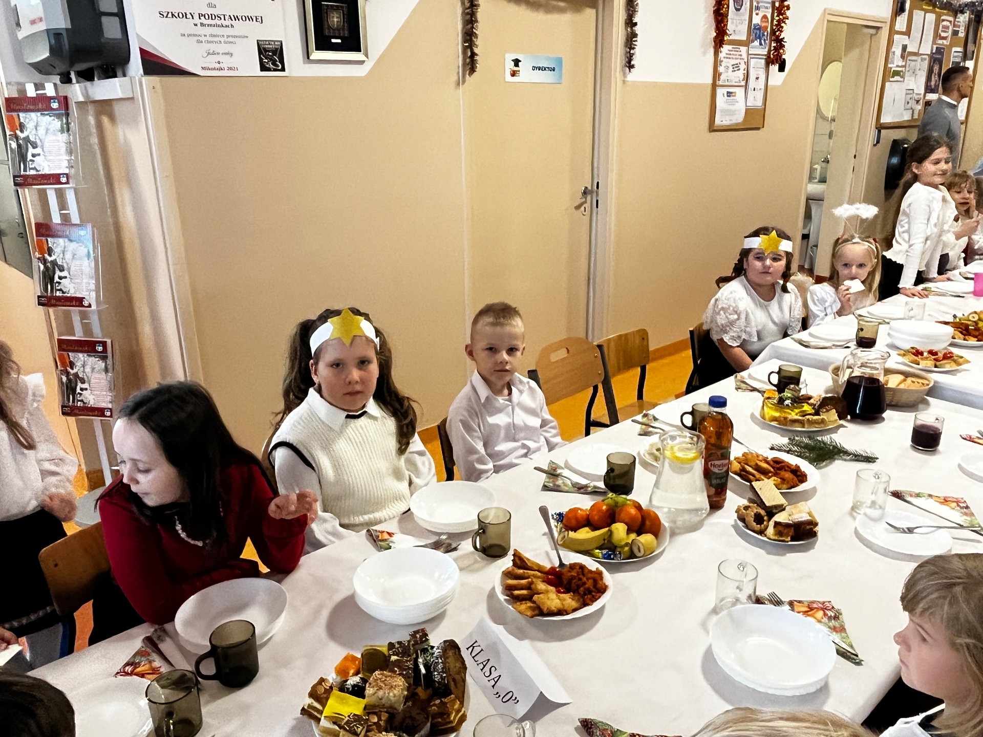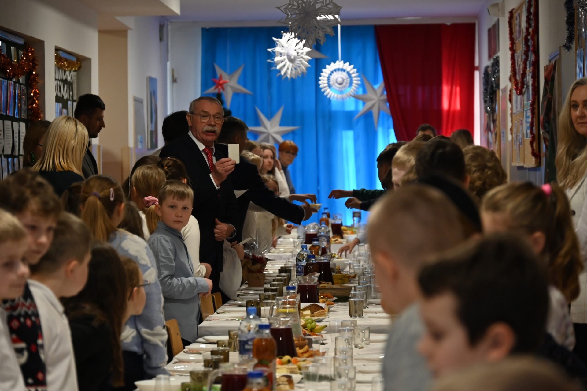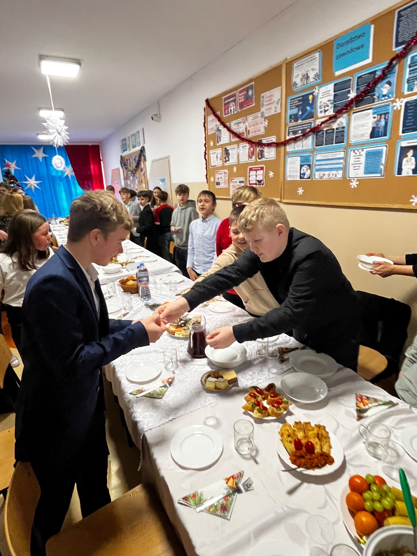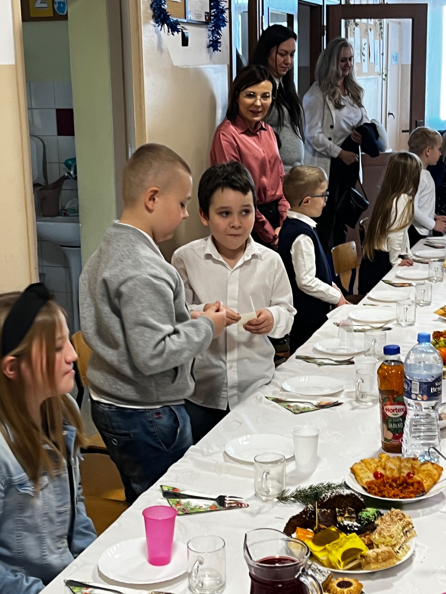 🧁Po części artystycznej przyszła kolej na spotkanie wigilijne. Już od kilku lat naszą tradycją jest wspólny stół wigilijny na szkolnym korytarzu. Po poświęceniu opłatków przez ks. Zbigniewa Kądzielę i życzeniach złożonych przez wójta Tomasza Lato, wszyscy zasiedli do stołu. Ależ było dużo pyszności!