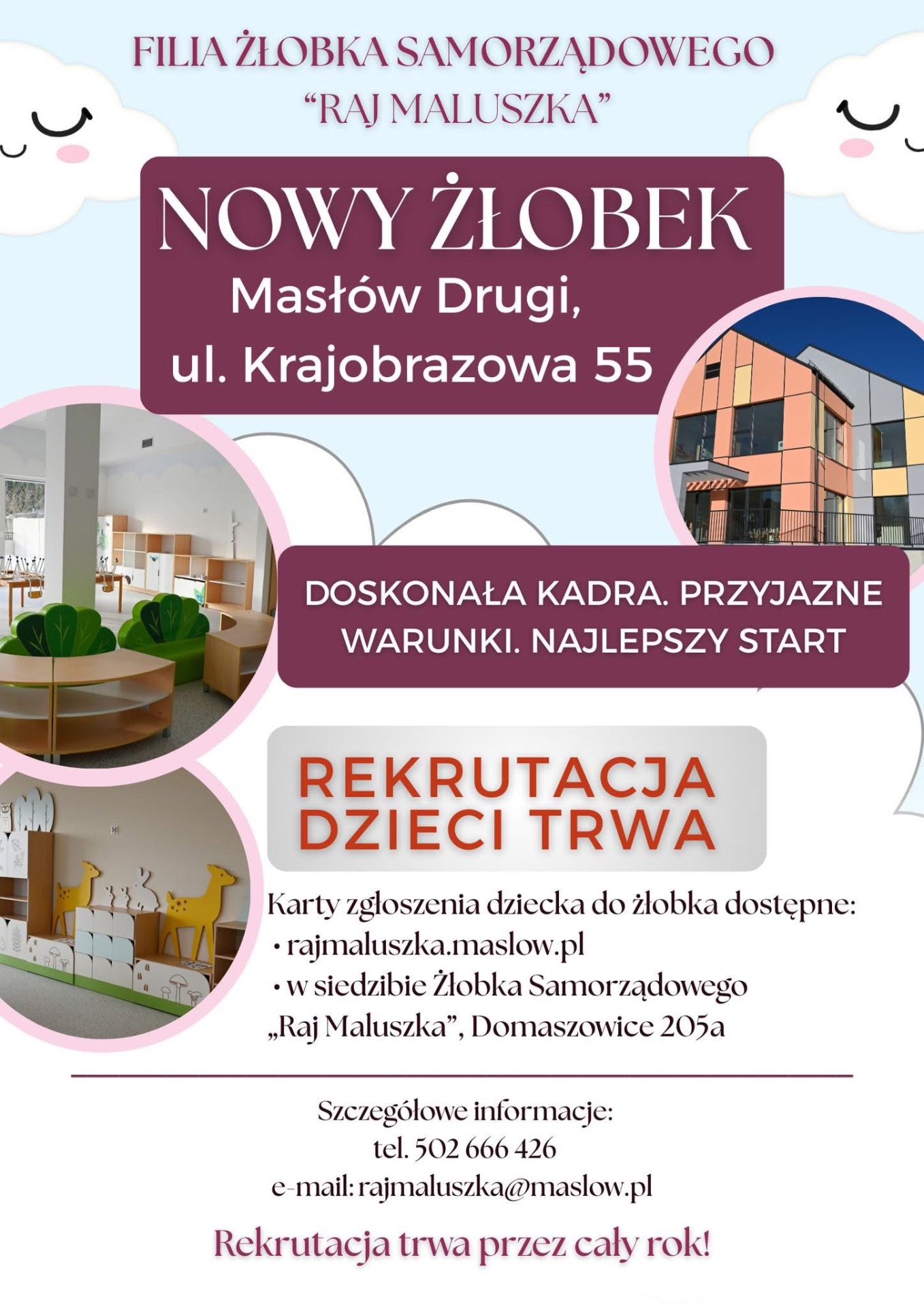 Rusza nowy żłobek w Masłowie Drugim w Gmina Masłów, a wraz z nim rozpoczęła się rekrutacja. W nowo wybudowanym obiekcie dzieci będą miały do dyspozycji doskonałą kadrę oraz znakomite warunki. Placówka ta jest filią Żłobka Samorządowego "Raj Maluszka" w Domaszowicach.